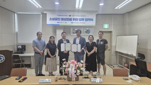 2025년9월1일 오후 4시 신창동 주택관리공단 3층에서 골목상권 활성화를 위한 첨단LC타워 상인회 회장(최병식)과 주택관리공단 남부지역단 단장(김헌중)이 업무협약식을 개최하였다.